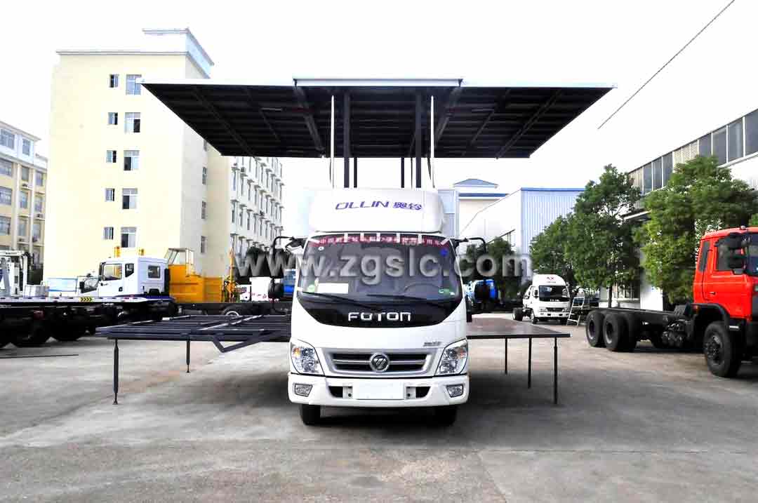 | 上裝配置 | ★ 舞臺(tái)車結(jié)構(gòu):通過機(jī)械裝置展開,箱體廂板分三層,內(nèi)外層彩鋼板,中間含減震泡沫,舞臺(tái)板為12MM竹膠膠板并預(yù)埋安裝舞臺(tái)燈光、音響等所需的專門固定位置及電源接口。廂體頂板采用汽動(dòng)缸將頂蓬板1/2掀起90度,廂體側(cè)板采用墻板助力器向下展開為舞臺(tái)的組成部分,舞臺(tái)臺(tái)板由支架和木龍骨、木地板構(gòu)成,適用于表演;分為固定舞臺(tái)板和活動(dòng)舞臺(tái) ★ 舞臺(tái)車配置:用于支撐活動(dòng)舞臺(tái)臺(tái)板的機(jī)械裝置,能夠調(diào)節(jié)高度,配置外接電源接口、配電箱、上下梯子一個(gè)。 | ||