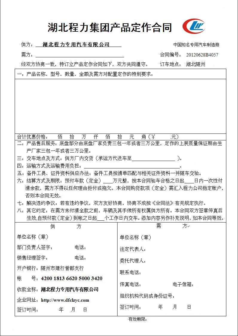 湖北程力集團產(chǎn)品定做合同主要包括:供方、需方、簽訂日期、產(chǎn)品名稱、數(shù)量、金額、定做要求、售后服務(wù)、交車地點、結(jié)算方式、解決違約爭議等內(nèi)容。值得注意的是,合同編號為日期加上銷售經(jīng)理房間門牌號,無編號的合同不能生效。望廣大客戶鑒別真?zhèn)危敺郎袭?dāng)受騙。 湖北程力專用汽車有限公司銷售部 |